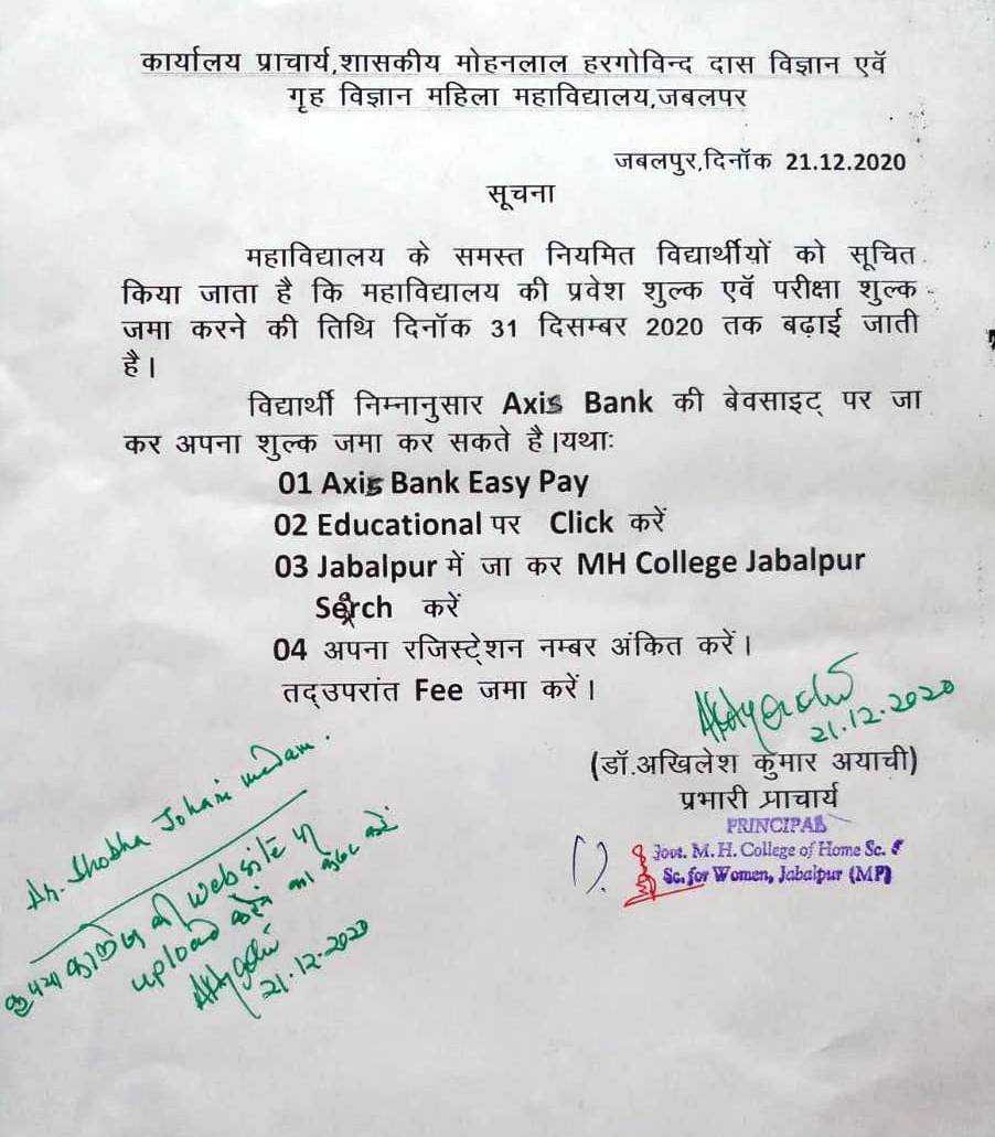 कॉलेज की प्रवेश शुल्क एवं परीक्षा शुल्क जमा करने की तिथि में वृद्धि हेतु सूचना 31.12.2020